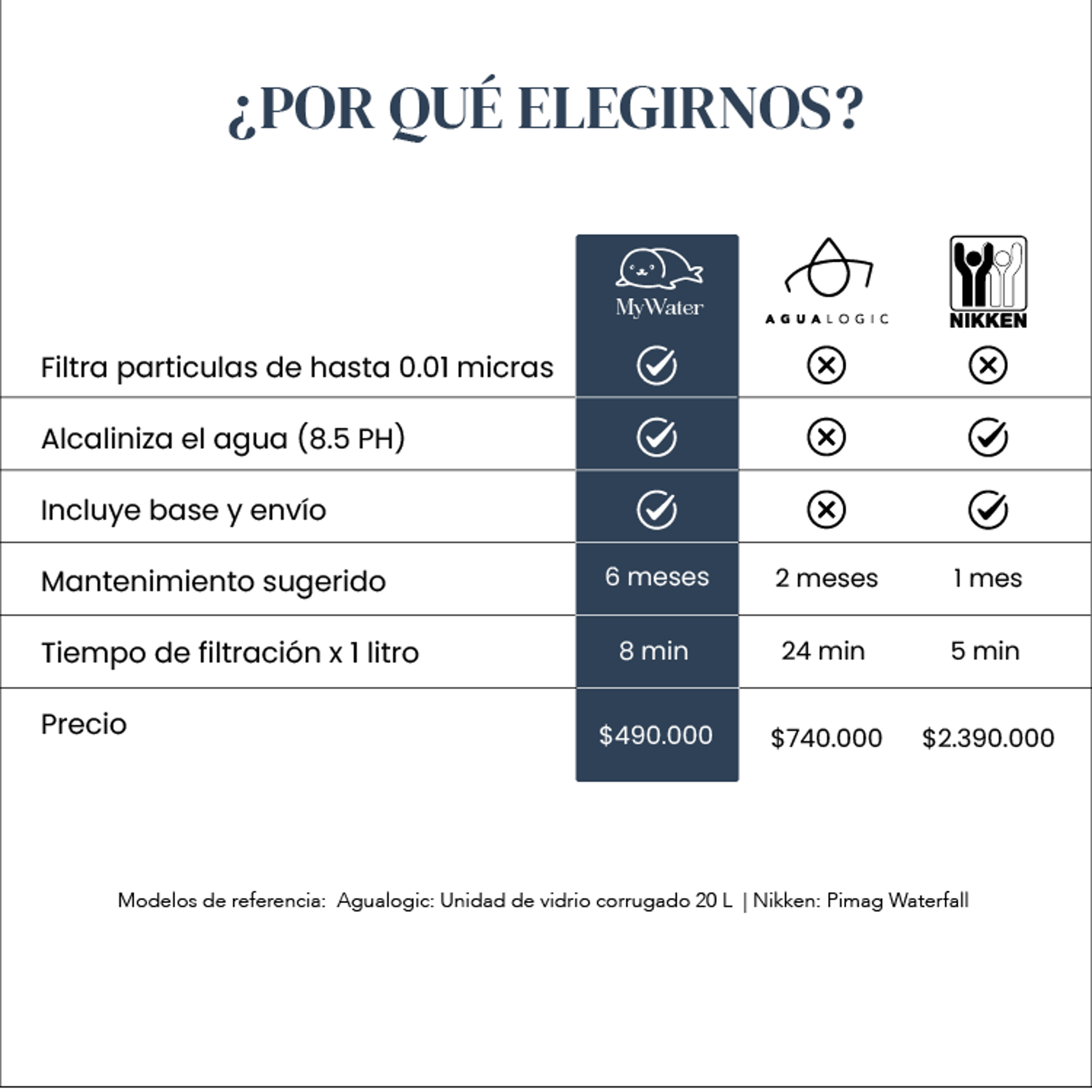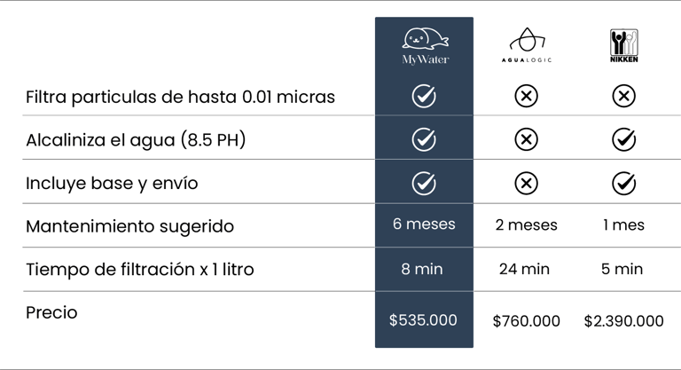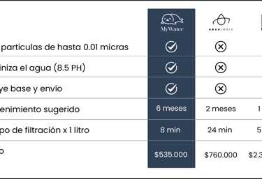 Con MyWater, obtienes agua purificada en casa por solo $45.000 cada 360 litros. Eso es menos de $250 al día por cuidar tu salud y la de tu familia.